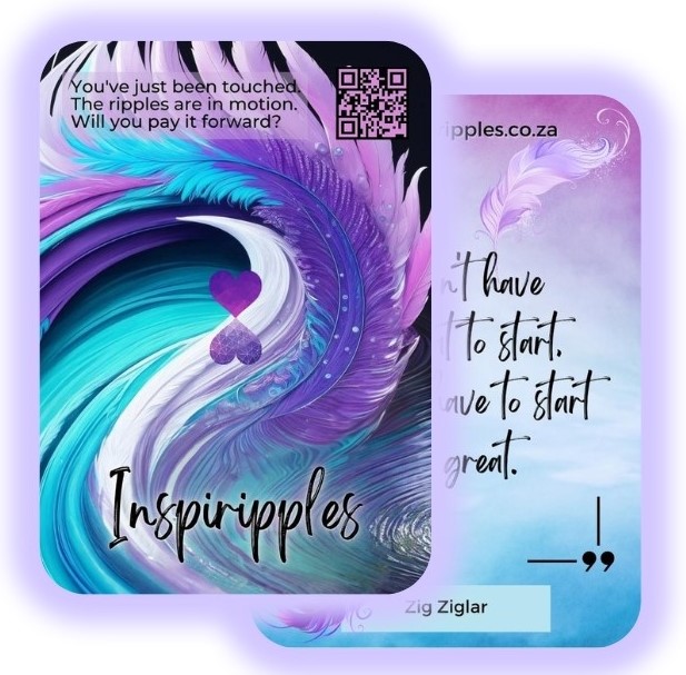 Inspiripples is a deck of cards carrying positive messages, carefully designed to uplift, encourage and acknowledge people. The idea is to create a ripple effect of kindness starting with something as small as a smile and encouraging words on a card.